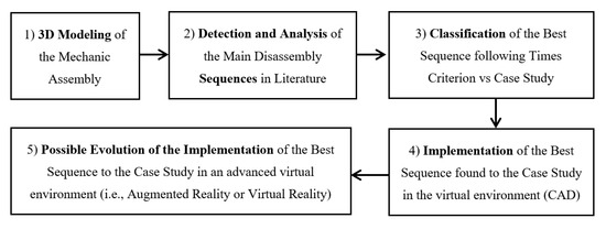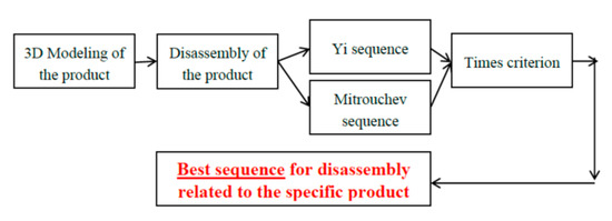 In order to find out the optimal sequence search algorithm, authors will go on applying two scientific sequences, part of literature in this filed, i.e., Yi algorithm and Mitrouchev algorithm (Figure 3). Applying both of them to the assembly previously designed, verifying subsequently through the “times criterion” the best one in term of speed, it is easy to find the most suitable disassembly sequence for the case study, i.e., the gearbox. It is important to underline that in absolute there is not a best sequence; the best sequence is always related to the specific product to which it is applied. Here, the flow-diagram summarizing the main steps of the work: