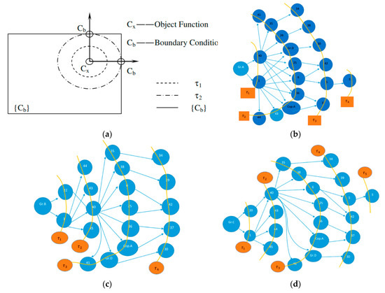 The Yi method [14] from this point of view was created with the aim of simplifying the search for the optimal disassembly sequence. Once an element has been chosen as a “target,” it is ideally imagined as the origin of a wave that crosses, neatly over time, all the other elements to which it is connected. The goal is to create a sort of “map” that highlights, moment by moment, all the different connection levels of the pieces to be traversed by the selected target at the ends of the mechanism, such as the effect of the propagation of a wave from the inside on the outside (Figure 4a–d).