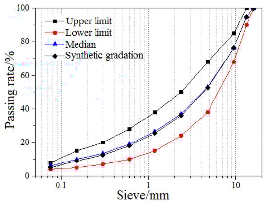 The AC-13 gradation of asphalt mixtures is a fine-grained, continuous gradation, and is mostly used for pavement surface layer. Therefore, the asphalt mixture in this paper adopted the AC-13 gradation. The gradation of asphalt mixtures, including the upper limit, lower limit, median, and synthetic gradation curve values of the aggregates, are shown in Figure 2. The synthetic gradation was used in this study to mix the aggregates of multiple grades in proportion and close to the median value of the gradation. The gradation curve of the asphalt mixture is the same as in reference [38]. For the experimental design, this paper adopted the Box–Behnken method. NTC and BF are asphalt admixtures. The upper and lower limits of admixtures and the ranges of asphalt ratios were determined according to the literature [10,39,40,41]. The selected three impact factor levels are shown in Table 6.