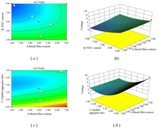 Using the same method as Section 3.1.1, the contour plot and the response surface plot between the air voids and each influencing factor were drawn. The results are shown in Figure 6.