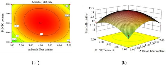 It can be seen from the surface graph that the incorporation of fiber and NTC significantly improves the Marshall stability of the asphalt mixture, but as the amount of both increases the Marshall stability first increases and then decreases. When the content of the fiber or NTC is too high or too low, the influence of other modifiers on the Marshall stability will become greater. The asphalt–aggregate ratio has a greater influence on the Marshall stability. The Marshall stability of the mixture will increase first and then decrease with the increase of the asphalt–aggregate ratio.