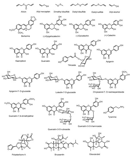 A detailed list of antiprotozoal activity of important medicinal plant extract and phytochemicals against foodborne parasites is provided in Table 1. Chemical structures of some of the plants derived bioactive compounds are given in Figure 1.