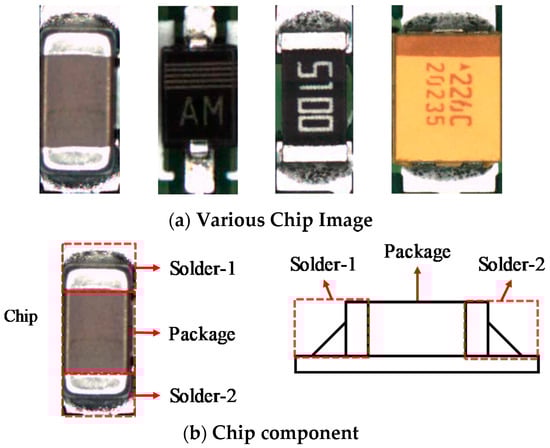 In this paper, the chip component consists of two solder regions and a package region, including a chip capacitor, chip diode, chip register, and tantalum capacitor. Figure 2a shows an image of these components. Chip capacitors, diodes, chip resistance, and tantalum capacitors are in order from the left. Components vary in size from 0.6 mm × 0.3 mm to 3.2 mm × 1.6 mm. Figure 2b shows the structure of the chip component, consisting of two solders and one package.