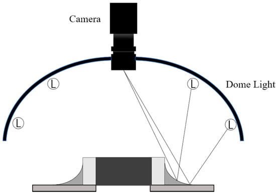 Figure 3 shows the dome-type illumination system. The system is used to obtain chip component images from the PCB. The illumination system has three colored LEDs: the red lights positioned vertically emphasize the flat area of the component, and the blue lights placed horizontally illuminate the beveled area of the component. The green lights emphasize the soft area of the component. Each light has a different irradiation angle; therefore, the color value is different according to the gradient of the surface. In the chip component image, the closer to red, the larger the gradient; and the closer to blue, the lower the gradient. We can then use the color value of the chip component image as gradient information. We can also indirectly infer the height of the chip components through this gradient.