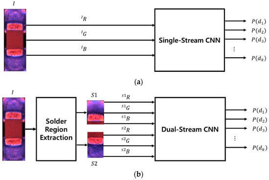 Figure 4b shows the structure of the assembly defect classification system with the dual-stream CNN. The inputs included the two solder region images ( and ) extracted from the chip component image , and the color channel image (, , and ; and , , and ). Note that the solder region image does not include the silk line, which disrupts the feature extraction of CNN.