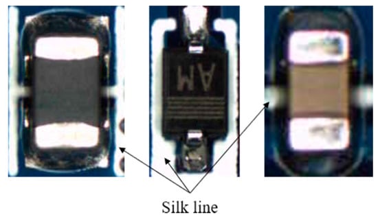 PCB background patterns in chip component images. The silk line is printed on the PCB to provide additional information about the component. Silk lines can adversely affect defect classifications because of their similarity to solder region.