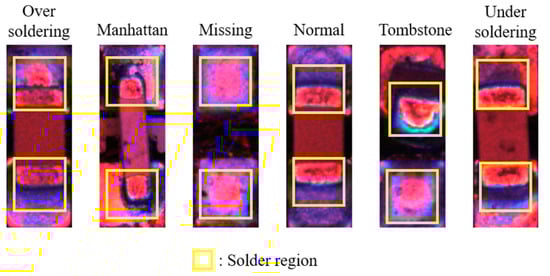 As described in the Introduction, most defect features are distributed in the solder region in the component, and as such the two solder regions can be used to classify both the package and solder defects. Figure 6 shows the solder region image based on defect type, wherein the defect feature is distributed in the solder region. Removing unnecessary PCB patterns can reduce the chance of misclassification in solder region extraction, and thereby increase its accuracy. In addition, the size of the chip component image can also be reduced. This optimization simplifies the CNN internal structure, reducing the overall weight capacity and computational time.