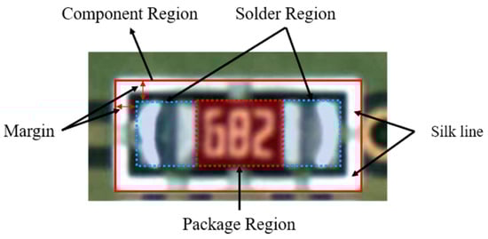 Figure 7 shows the PCB image of a chip component consisting of the package region, solder region, silk line, and component. To detect assembly defects, the chip component region is set to an extended region rather than being limited to the solder region. The extended region includes various pattern images in the PCB, such as silk lines. This background is excluded in the solder region extraction step.