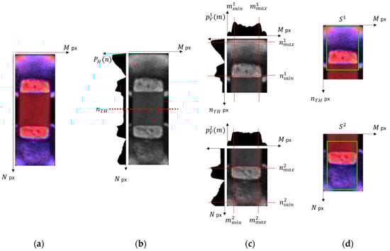 From the horizontal projection, the split point () for dividing the chip component region into two regions is calculated. The split point is the coordinate of the n-axis (y-axis) that divides the chip component into two regions. As shown in Figure 6, normal chip components have similar vertical projection values both above and below. However, since defects such as under-solder, over-solder, and Tombstone have different color distributions in the upper and lower solder regions, it is necessary to divide the chip component into two regions for accurate solder region extraction. In the horizontal projection shown in Figure 8b, the chip component is divided into two regions. We then used the Otsu method [27] on the horizontal projection to obtain the threshold value and used it as the split point