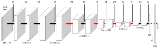 In Figure 9, C#, P#, and R# represent a convolutional layer, max pooling layer, and ResBlock layer of Figure 10, respectively. The convolution layer C# has a kernel size of 3 × 3, padding = 1, and stride = 1. The max pooling layer P# has a kernel size of 2 × 2, padding = 0, and stride = 2. The ReLu function was used as the activation function of the convolution layer and the fully connected layer. Unless otherwise noted, the convolution layer and max pooling layer will have the same configuration.