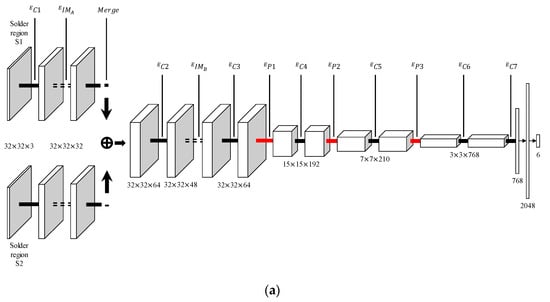 Dual-stream CNN generates a classification model using two solder images ( and ), which consist of the color channel image (, , and ; and , , and ). Figure 11 shows two different structure of dual-stream CNN. Each input datum has a size of 32 × 32 pixels. The output of the final stage of the dual-stream CNN is the probability value for each defect, similar to that of the single-stream CNN.