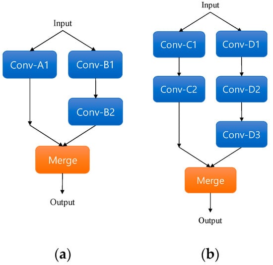 An early-merge dual-stream CNN is a network structure in which the merge is performed in front of the network (Figure 11a). In an early-merge dual-stream CNN, the input data is converted into 32 × 32 × 32 feature maps through . Each feature map output from passes through an inception module (IM) [31]. The IM has a wide reception field, as it combines convolution layers having various kernel sizes, allowing for efficient feature map extraction. and (Figure 12 and Table 1) represent the structure of the inception module used in this paper.