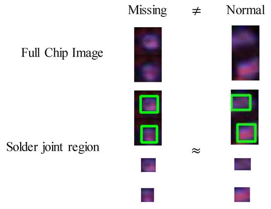 In some samples, however, the dual-stream CNN did not correctly classify defects that were correctly classified by a single-stream CNN. In Figure 13, the entire chip component image can be classified with the naked eye, but the solder region alone makes it difficult to classify the difference between the two defects. This phenomenon becomes more prominent with microchips and can be attributed to the small size of the chip component image. As the pixels of the camera are fixed, a smaller component will have a smaller image. Solder regions that can be obtained using low-resolution chip component images are limited, thereby limiting the defect information that can be obtained. Consequently, a small chip component image will make it harder to extract the solder region.
