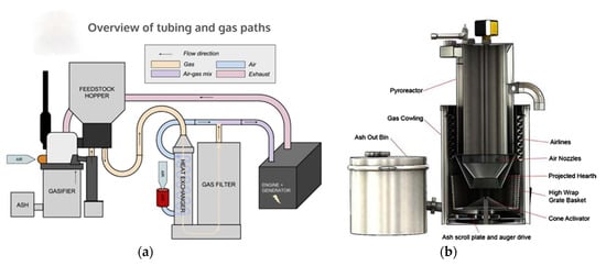 The gasification tests were performed on an AllPowerLabs PP20 Power Pallets—a gasifier with a power of 15 kW (Table 5 and Figure 2), a common downdraft reactor that is combined with an electric power generator and an electronic control unit. [56]. The equipment consists of a storage silo, where the biomass is simultaneously dried by recirculating the hot gases produced in the reactor. Fuel is supplied from the top as the air moves downward, being preheated through contact with the reactor’s walls.