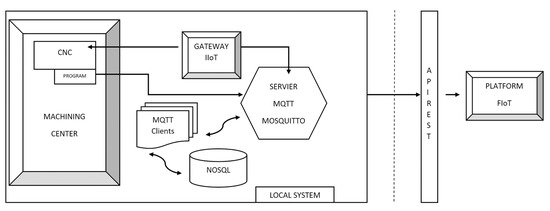 Over the past 10 years, different technologies have boosted data-acquisition, communications, and processing capabilities. This strong development has led to the inauguration of a new concept: the Internet of Things (IoT). Although this concept might have direct applications in the daily life of the public, its successful implementation in industrial environments seems to be a more complex issue, as recent reviews have outlined [1]. This is the case of machining workshops, where many factors limit the range of IoT solutions. First, the integration of new sensors in existing machines is not easy, as durable machine-tools are usually designed for a long life and most existing machines were built before the development of the IoT or the Industry 4.0 paradigms [2]. Therefore, communication capabilities and integrated sensors built into machine-tools are very limited. In those cases, the only way to extract information from them would be through the machine’s CNC (Computer Numerical Control). However, the CNC is not often available, given that its primary function is to control the machine-tool. Therefore, the most common solution is to access the PLC (Programmable Logic Controller) of the machine. Reading the PLC parameters is one way of extracting many parametric values from the CNC. This solution has been widely used during the last decade; i.e., for developing adaptive remote controllers for milling machines through an internet connection [3].