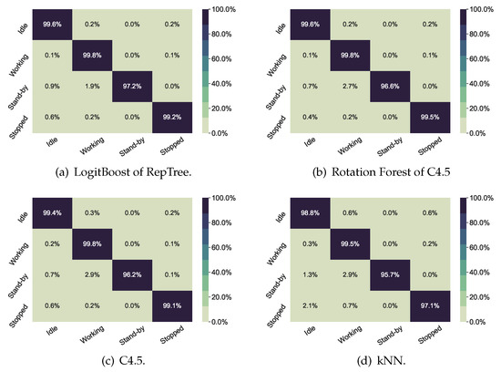 In short, the high performance that Bagging of Random Balance achieved for Mode prediction, and LogitBoost for State, will guarantee that this model can identify these two process parameters. The combination of both can surely identify the main production activity of the machining center. Some examples of these combinations are: (1) reference fixation of a new workpiece (idle state and manual mode); (2) workpiece milling operation (working state and automatic mode), test of a new milling program (idle state and MDI mode), and load/unload of a workpiece (stopped state and Pass mode). Therefore, the prediction model can extract useful information on how the machining time is distributed, not from an Engineering Department planning report, but from the real workshop reports on the daily situation.