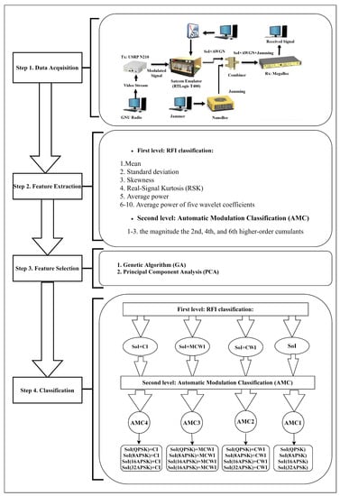 The focus of this research study is on recognizing and characterizing the received radio frequency signals. To this end, a hierarchical classification design is proposed in which the first level deals with signal type recognition, and the second one automatically classifies the modulation type. Figure 1 presents the overview of the set-up, configuration, and framework of this study. It includes four main steps, namely data acquisition, feature extraction, feature selection, and classification. Each step is presented in detail in the rest of this section.
