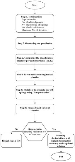 GA is known as a search-based optimization technique inspired by Genetics and Natural Selection [42]. GA has been widely used not only for feature selection but also for optimizing the hyper-parameters of an Artificial Neural Network (ANN), such as weight [40,43,44,45,46,47,48,49,50,51].