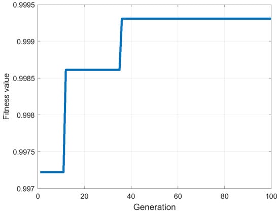 - Termination criterion: The algorithm is terminated when a set number of generations is reached. Figure 4 shows the variation in the best fitness values during 100 generations for RFI classification using five features. The result presents the improvement in the classification accuracy of over 100 number of generations up to . Moreover, the best fitness value corresponds to the chromosome , which indicates that the more informative features are the standard deviation of the received signal and average power of the 4th wavelet coefficients ( to ) using Daubechies 10 (dB10) wavelet.
