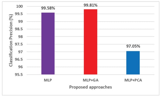 Figure 7 illustrates the computation times of the presented techniques for the RFI classification. To this end, we used the “tic toc” function in MATLAB to calculate the consumed training time. As the results show, GA + MLP is computationally more expensive, and as a result, the computation time is comparatively longer, while MLP + PCA is the most efficient one.