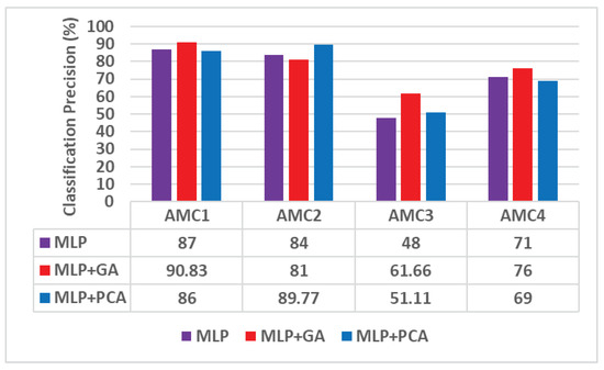 Figure 6 indicates the results of the proposed classifiers for the second classification process to distinguish four modulation types (QPSK, 8APSK, 16APSK and 32APSK). As the results present, in no jamming case, the highest accuracy is achieved using MLP + GA () with an accuracy of . For AMC2, MLP + PCA () outperforms other techniques with a precision of 89.77%. In the presence the two other jammers such as MCWI and CI, MLP + GA performs more precisely.
