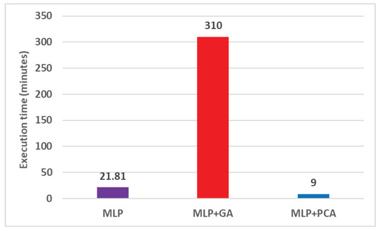 Comparative training time for MLP (21.81 min), MLP + GA (310 min) and MLP + PCA (9 min).