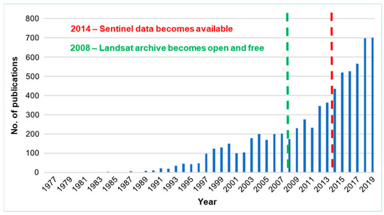 Figure 1. Number of earth observation (EO)-related geohazards publications per year for papers in journals, books, and series. The search was performed through the Web of Science portal based on the following keywords (in quotes) and Boolean Operators (in uppercase): “Earth Observation” OR “Remote Sensing” AND “Geohazards”.
