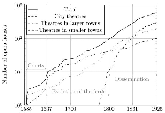 Figure 2 shows the evolution of theatres in Italy: after the initial period of court theatres (1585–1637), the evolution of the form as it has been discussed, and the 19th century provided the dissemination of opera house. In order to host the main representations, in each city a mid- or large-sized theatre was built. According to Prodi et al. [44], a ‘mid-sized’ group means a volume of the main hall between 3000 m and 9000 m, corresponding to a current occupancy of 800–1000 people. A ‘large-sized’ group means a volume larger than 9000 m, corresponding to more than 1300 seats.