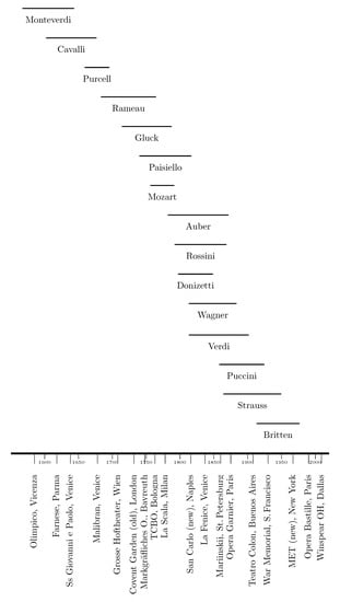 Timeline of some of mentioned opera houses of and life span of some of mentioned composers.
