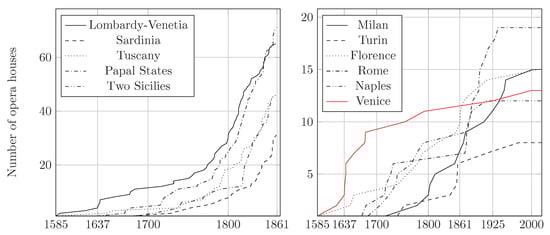 - Until 1861, Italy was still divided into pre-unitarian states. In this period the theatrical form was well defined, and it was replied in order to have a opera house in each town. As shown in Figure 5, this dissemination process varied depending on pre-unitarian state, earlier in the Kingdom of Lombardy–Venetia, then in the Grand Duchy of Tuscany and in the Papal State, later in the Kingdom of Two-Sicilies and in the Kingdom of Sardinia. There were social and cultural reasons to this temporal misalignment, but after the Italian unification the differences were diminished. In Italy, opera played a role of unification between people who spoke slightly different languages and had somewhat different cultures. For instance, during the Risorgimento process, the sentence “W V.E.R.D.I.” was used also as acronym, meaning “W Vittorio Emanuele, King of Italy”. Furthermore, some G. Verdi’s operas, such as Nabucco (1842) or I Lombardi alla Prima Crociata (1843), hidden the revolutionary instances of the Lombard people which was under the Austrian government until 1861. It should be noted the case of peripheral regions of the Papal State—corresponding today to Umbria, Marche and Romagna regions—in which each city, large or little town was provided by its own opera house. A huge number of these small-sized theatres still exist. Some of them were surveyed by local studies, such as in the case of Campania [81], Romagna [20], Marche [82], Puglia [83], and Veneto [84]. Due to the well-defined form, architects repeated the same project with few variations. Indeed, theatres built in the same geographical area and in the same years often shared the same workers and same building techniques. Due to the large number of small/mid-sized opera house, a “regional” typology can be identified.