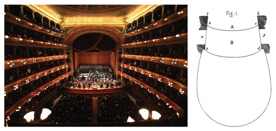 The evolution of the opera during the 19th Century needed more instruments. This was one of the reasons for the original Wagnerian idea of mystic gulf, conceived for the aforementioned Bayreuth Festspielhaus (1872) [57]. However, that was not the only reason: the dramaturgy was increasing in complexity. More complex characters meant more focusing on the soloist. The presence of the orchestra pit increases the envelopment and increases the reverberance ( ratio higher than one). The pit provides the perceptual effect of moving the orchestra to the background, while the soloist are still well ‘focused’ on the stage. This was the reason why some authors compared the Wagnerian opera—and the Festspielhaus—to the birth of Cinema: the soloist is the actor, the orchestra is the background [192]. During the 20th Century, orchestra pits were progressively introduced in Italian theatres [23,91]. It should be remarked that orchestra pits require further adjustments, to increase the communication to hall and stage [76,193], and to ensure safe working conditions to musicians [194,195].