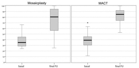 Both groups showed a marked improvement of all clinical scores from baseline to the last follow-up. The IKDC subjective score improved significantly in the mosaicplasty group from the basal level of 38.1 ± 11.8 to 75.3 ± 21.8 (p < 0.0005) at the final follow-up. Similarly, in the MACT group there was a significant improvement from the basal level of 37.6 ± 14.9 to the final follow-up of 81.8 ± 13.0 (p < 0.0005). No significant differences in the IKDC subjective scores were found between mosaicplasty and MACT groups (Figure 1).