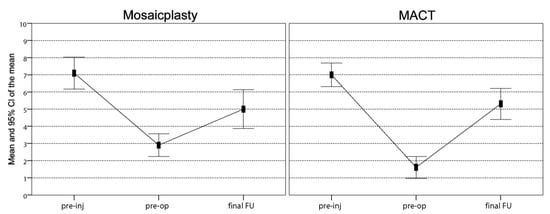 Two patients of the mosaicplasty group failed (one with four plugs and one with three plugs) and were treated with MACT 2 years after the treatment, fixing a 10% reoperation rate. At the final mean follow-up of 12 years, three more patients in the mosaicplasty group (one patient with one plug, one with two plugs, and one with four plugs) were considered clinical failures, for an overall failure rate of 25%, significantly higher compared to the MACT group, where no surgical or clinical failures occurred (p = 0.016).