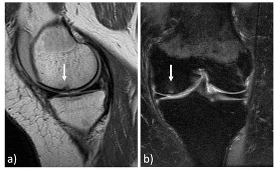 MRI evaluation at 9 years’ follow-up of a medial femoral condyle lesion treated with matrix-assisted autologous chondrocyte transplantation in a 39-year-old woman. Sagittal 3D "Cube" PD (a) and coronal PD FAT SAT (b) demonstrate a good filling of the defect (arrows) and integration into adjacent cartilage, a homogeneous structure and a normal signal intensity of the repair tissue. Moreover, no significant bony defect, bony overgrowth, or major subchondral changes were detected.