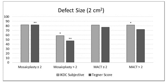 Evaluation of the defect size effect on the International Knee Documentation Committee (IKDC) subjective score and the percentage Tegner Score improvement at a final follow-up of 12 years in both groups of patients. The asterisk (*) indicates for the MACT group a tendency for higher subjective results compared to the mosaicplasty group for the defect area > 2 cm2 (p = 0.092). The double asterisk (**) indicates a lower improvement in terms of Tegner Score for the defect area > 2 cm2 in the mosaicplasty group (p = 0.014).