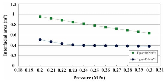 - It shows that the pressure influences the gas/liquid interfacial area. By increasing the pressure, the gas/liquid interfacial area slightly decreases at a low inlet gas flow rate. At a higher inlet gas flow rate, the gas/liquid interfacial area was significantly decreased.