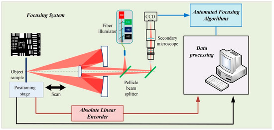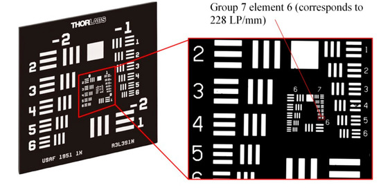 In this study, imaging characteristics of the focusing system were evaluated by using the method of imaging a 1951USAF resolution target, as shown in Figure 5. Initially, it is placed near the focal plane of the objective lens. The focusing of the resolution target with the microscope measuring device was realized by the automated focusing method described above.