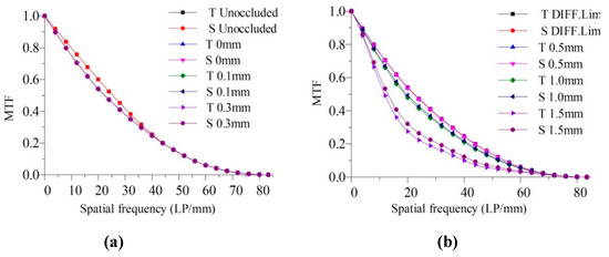 Figure 2 compares the modulation transfer function (MTF) of the designed mirror-based objective with that of the ideal optical system without obscuration. As shown in Figure 2a, the MTF of the mirror-based objective we designed is close to that of the ideal image when the half-field is smaller than 0.3 mm; due to obscuration effect, the performance of the objective in the middle and low frequency is slightly lower than that of the unobscured objective. Figure 2b shows the MTF of the optical system for larger fields. It can be seen that the MTF corresponding to a 1 mm half-field still basically coincides with the ideal MTF. When the field of view increases further, the MTF of the mentioned mirror-based objective is lower than that for an unobscured objective in the low and medium spatial frequencies. It should be noted in particular that the optical system has been carefully optimized, therefore, the different curves (T, S. T DIFF. Lim, etc.,) in the MTF curve (Figure 2a) in the small field of view are close to coincidence. Therefore, it cannot be completely independently reflected in the figure.