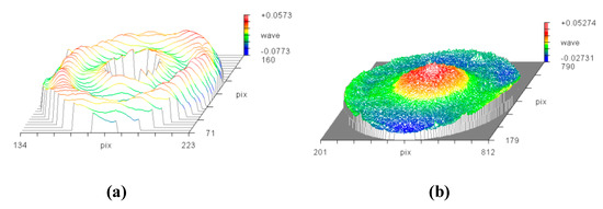 The primary and secondary mirrors of the aspheric Schwarzschild objective are made of fused quartz by a traditional optical processing method. The diameters of the two mirrors are 210 and 29 mm. Protected aluminum film is used to cover the machined surfaces. The results of the optical surface (without coating) are measured by a Fizeau interferometer, which indicates the deviation between the actual surface and the ideal surface, as shown in Figure 3. It can be seen that the peak-to-valley (PV) value of the surface was 0.135 and 0.08 λ (λ = 632.8 nm), respectively, for the two mirrors. According to Rayleigh’s judgment, as the surface PV value is less than λ/4, the surface error will have very little effect on the image quality.