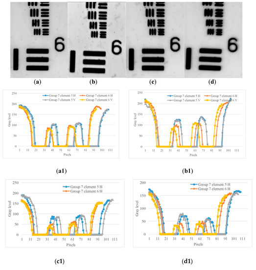 Imaging results obtained using the 1951USAF resolution target with different wavelength light sources. (a) Image at λ = 480 nm; (b) image at λ = 550 nm; (c) image at λ = 660 nm; (d) image at λ = 850 nm. (a1)–(d1) are the horizontal and vertical intensity profiles of the four images in group 7 element 5 and group 7 element 6, respectively.