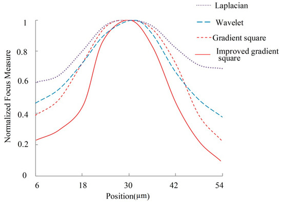 In order to make valid comparisons, the focusing performance under different evaluation functions is analyzed, applying different evaluation functions—the Laplacian algorithm [16], the wavelet algorithm [17], the gradient square [18] algorithm and the improved gradient square algorithm, which are shown in the Equations (1)–(4). The autofocusing algorithm is used in sequence of Figure 7, each focusing algorithm produces a focusing curve as shown in Figure 8, and the extreme point of the curve is the optimal focusing position. Compared with the four focusing algorithms under the experimental conditions in this paper, the improved gradient algorithm has better performance in focusing, and this algorithm is used for fitting in subsequent experiments.