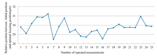 In order to verify the accuracy and reliability of our focusing results, repeated focusing experiments were carried out. The resolution target and the microscope measuring device were adjusted to their initial positions, and the focusing process was repeated 25 times. The relative distance between the initial position and the optimal focusing position was obtained, and a comparison of these results for the 25 repeated focusing processes is shown in Figure 9; the peak value and standard deviation of the repeated measurement datasets are 2.74 and 0.75 μm, respectively, which demonstrates that the experimental equipment constructed in this study can achieve high precision focusing.