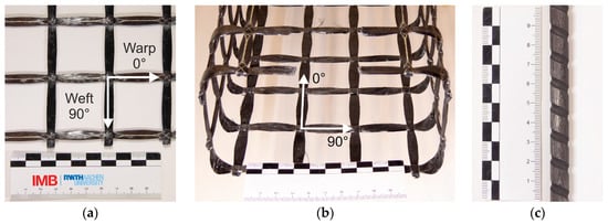 For the experimental part in this study, various non-metallic reinforcement types were combined to make use of their individual strengths. The main reinforcement in the tension flange of the I-shaped beams was a non-prestressed CFRP rebar (Figure 1c, and Table 2) with milled helix ribs. As shear reinforcement, an epoxy-impregnated biaxial carbon grid was utilized. This type of reinforcement is pre-impregnated and pre-hardened by the manufacturer. Figure 1a shows the open structure of the symmetrical reinforcement with a 38 mm axial spacing of the yarns in both directions. Pre-formed textile grids made of CFRP (Figure 1b) or alkali-resistant (AR-) glass (GFRP) served as reinforcement of the flanges. Both had the same mesh geometry as the planar shear reinforcement.