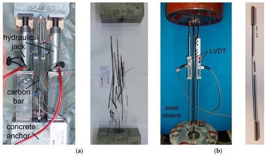 (a) Testing of carbon bars in uniaxial tension with concrete anchorage and (b) with adhesive anchorage in steel sleeve.