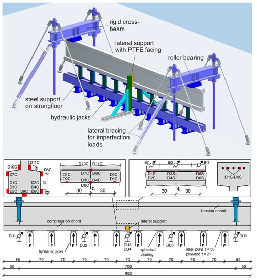 To test the beams with a uniformly distributed load, an inverse setup was employed (Figure 3) [60]. Ten equally spaced hydraulic jacks connected to one hydraulic circuit applied the load to the lower chord of the beams. A package of steel (300 × 300 × 30 mm) and plywood (t = 21 mm) plates reduced local stress concentrations. Spherical bearings centered the vertical load while curvature of the beams increased during the test. Initial geometrical non-linear finite-element calculations employing a horizontal line-load equivalent to an imperfection of 30 mm in mid-span predicted deformation-induced lateral failure of the beams’ compression chord prior to bending failure. Thus, lateral supports in mid-span with polytetrafluorethylene (PTFE) facings were added. All specimens were tested under quasi-static conditions with a load rate of 10 kN/min. At predefined intervals, the test was halted to mark new cracks and document the crack pattern. After reaching a midspan deflection of 28 mm, all beams were completely unloaded and reloaded to identify plastic deformation and remaining crack-openings.