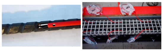 Vertical displacement (DU1–DU6) was measured at supports, in in mid-span and at two locations in between (Figure 3). Three horizontal linear variable displacement transducers (LVDT) Bi1–Bi3 in the tension zone and nine (eleven for FT02) concrete strain gauges in the compression chord tracked deformations from the exterior. For internal measurement, strain gauges were applied to the main carbon bars. Therefore, one section of a rib was carefully sanded off without damaging the core diameter of the bars and the gauges were glued on the CFRP rebars. The feasibility of this measurement was evaluated in previous uniaxial tensile tests, where strain measurements with conventional LVDTs and strain gauges yielded similar results. For FT01 and FT02, six gauges (D1S–D6S) were fixed at the second and fourth bar of the outermost reinforcement layer (Figure 3 and Figure 4). For FT03, a total of eight gauges were used, four outside of the splice, and four in the first and last third of the splice length.