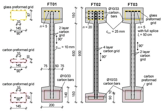 The slenderness of l/h = 700/90 = 7.8 resulted from full utilization of the non-prestressed carbon rebars at ULS and complying with SLS requirements for FT01, i.e., deflection limit. No precamber was chosen for the beams. The width of 200 mm for the tension flanges was necessary to place 20 bars of FT02 with adequate spacing. The same width was chosen for the compression flange to increase lateral stiffness. The depth of 150 mm of the tension and compression chords ensured anchorage of the planar shear reinforcement (see e.g., [39] for determination of the full anchorage length in warp direction of 78 mm for a comparable cementitious matrix). However, the compression chord depth for FT02 was reduced in mid-span to diminish the resistance of the compression zone in order to provoke flexural compression failure of concrete. A web width of 50 mm allowed for concreting the beams in upright position with 4 layers of shear reinforcement for FT02. A minimum concrete cover of 10 mm was chosen in the web based on previous experience from uniaxial tensile tests [62]. Previous studies on tensile specimen reinforced with the same carbon rebar indicated that a cover of 25 mm is necessary in the tension zone to transfer bond forces [40] without premature longitudinal cracking and concrete spalling. The same cover was chosen for the grid in the compression flange. As shown in Figure 5 (left), preformed grids in compression (CFRP grid) and tension flange (GFRP grid) were chosen to take the tension forces resulting from lateral connection of the outlying rebar and concrete areas. The profiles were open to the center of the beam, allowing the primary shear reinforcement to penetrate and securely anchor in the flange. To close the open profiles and to increase the resistance in lateral direction, short carbon bars from the same material as the main rebars were added (see Figure 6). AR-glass fabrics were chosen specifically for the tension flange for their higher ultimate strain (Table 1) to prevent premature rupture of the longitudinal yarns and spalling of the concrete. The lap length of 50 cm was chosen based on bond strength value from Eurocode 2 [63], clause 8.4.2, using mean tensile strength of a C100/115 (fctm = 5.2 MPa), for ultimate strength of carbon bars (1828 MPa) and the corresponding diameter (8.9 mm). Because of self-compacting concrete properties, good bond conditions were assumed and a factor α6 = 1.4 was assumed.