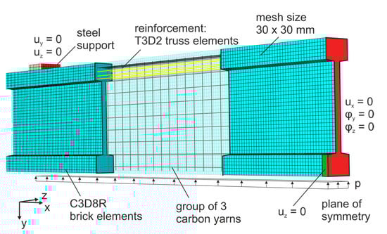 ABAQUS/CAE [66] was employed in a refined geometrical and physical non-linear FE analysis. Key input parameters are given in Figure 7. For simple bending analysis, a 2D-modelling approach would have been sufficient and computationally much more efficient. Beams FT01 and FT02 were modeled in 3D using symmetry conditions to be able to account for global stability (lateral deformation-induced failure of compression chord) and local stability (deformation-induced failure of the web in compression). For textile reinforced concrete, often a smeared approach to modeling reinforcement is chosen (see for example [67]). Here, all tension reinforcement is modeled discretely, using two node truss elements with experimentally determined material characteristics given in Table 1 and Table 2. For shear reinforcement, three CFRP yarns were bundled in one truss element to reduce total computational time, while CFRP bars were modelled individually. The reinforcement was embedded in 8 node brick elements forming the concrete body with perfect bond. All parameters for concrete damaged plasticity model (CDPM) are listed in Figure 7 (right). Uniaxial compression behavior is predicted with the model by Sargin [68], and for simulation of concrete under tension, the model by Hillerborg [69] is used. Calculation was performed with general/static increments of pressure on the loaded surface, with maximum step size 0.01 and minimum step size 1 · 10−9, which represent a percentage of the maximum applied pressure.