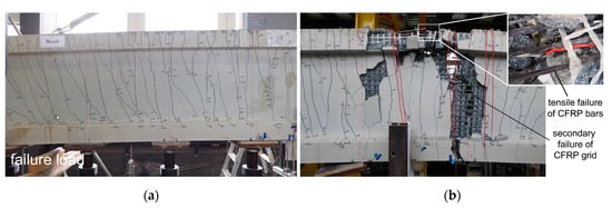 As all beams were tested to failure, their distinctive fracture pattern gives insight on load-bearing mechanisms. With FT01, a brittle rupture of the main bending reinforcement in mid-span was observed at a total load of 686 kN (Figure 8). This was the predicted and desired failure mode. The sudden release of energy upon rupture of CFRP bars led to a brittle failure without residual load-bearing capacity. As secondary effect, the horizontal yarns of shear reinforcement ruptured and subsequently web concrete cover was spalled. No premature spalling of concrete in the tension chord or rupture of the glass grid could be observed prior to reaching ultimate load.