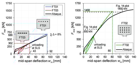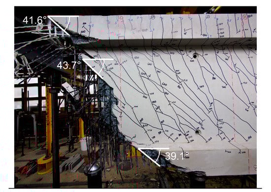 The limit of shear resistance was determined with a strut-and-tie model with variable inclination of the compression field from EC2 [64]. While for FT01 with two layers of shear reinforcement a strut inclination of cot(θ) = 2.5 was chosen, for FT02 with a doubled shear reinforcement a strut inclination of 45° was estimated. In both cases the maximum compressive stress of the concrete strut was σc = 0.6 · (1 − 100/250) · 100 = 36 MPa. Strain in shear reinforcement of FT01 did not exceed 2.87‰. Direct loading within distance d from the support was not considered in shear verification. The strain in shear reinforcement of FT02 was calculated to 8.3‰, which is lower than the upper limit 9‰ given e.g., by [65].